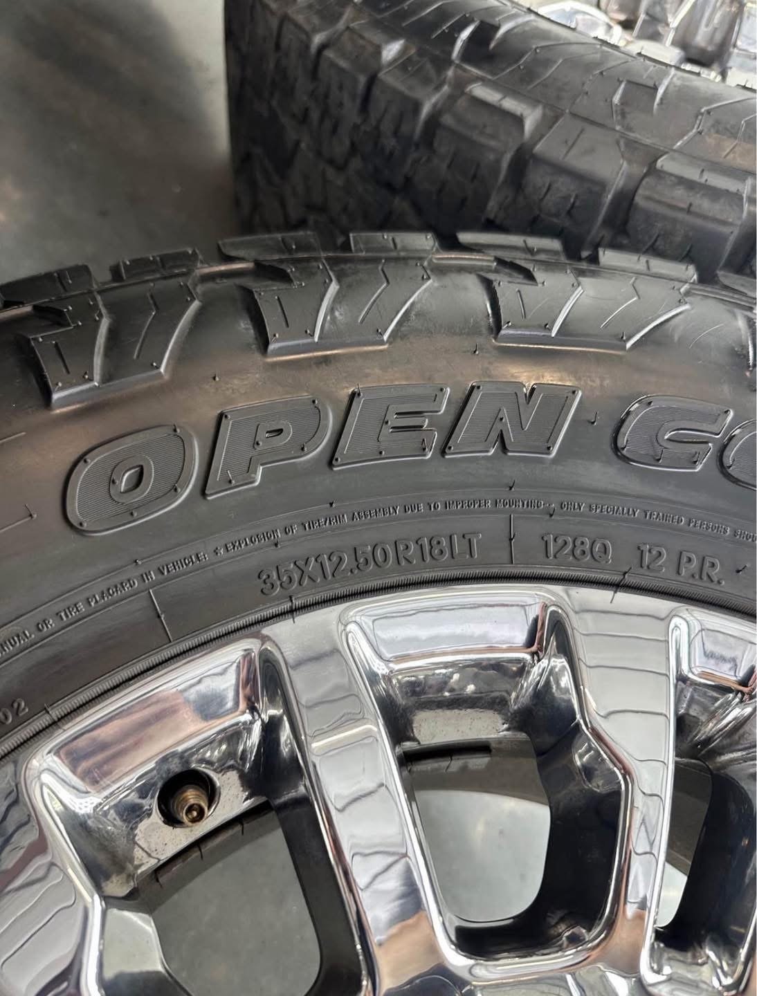 Tires are 35×12.50r18 Toyo open country at3, load range F 12ply, top of the line tires, no patches or plugs in them, tires have lots of tread left.