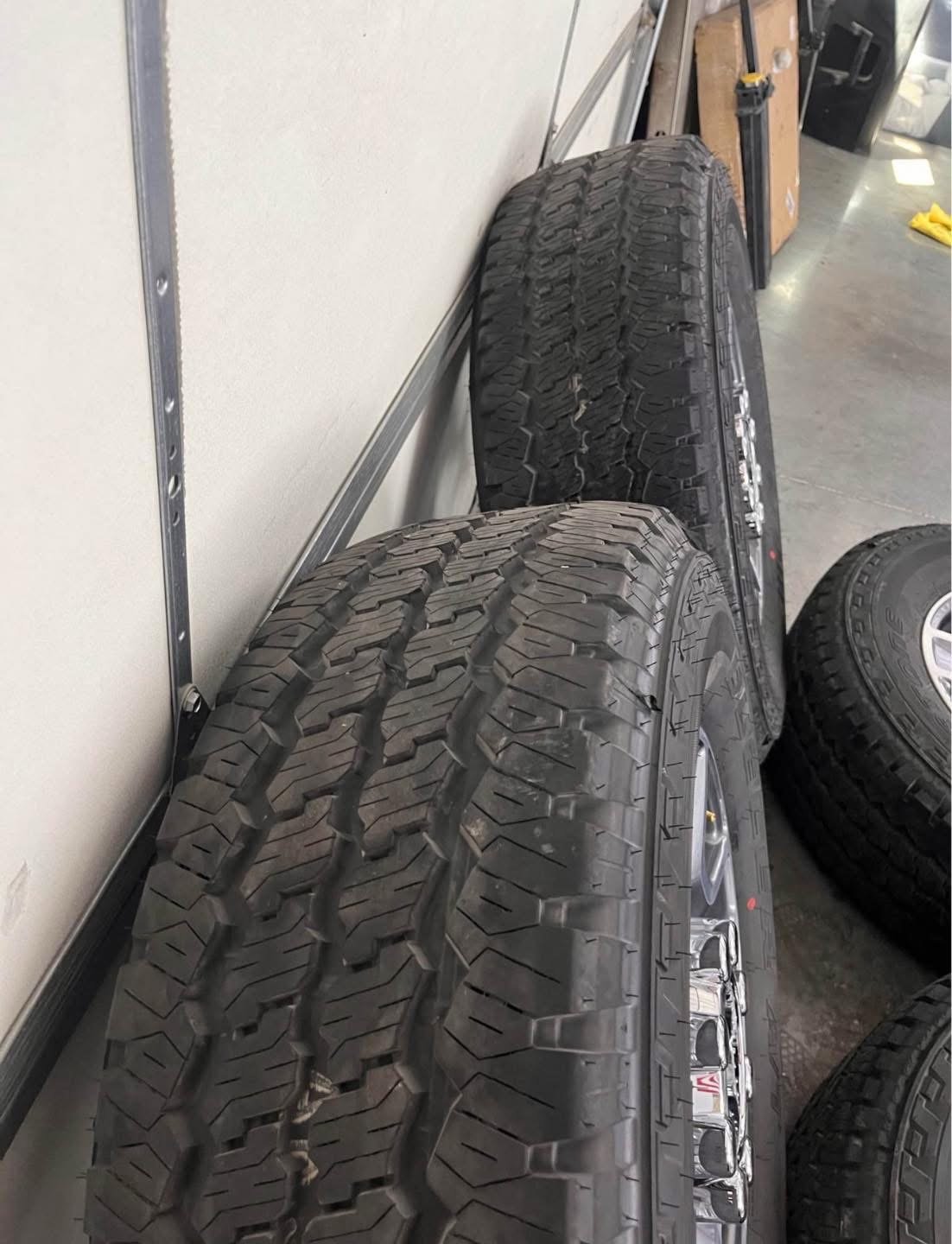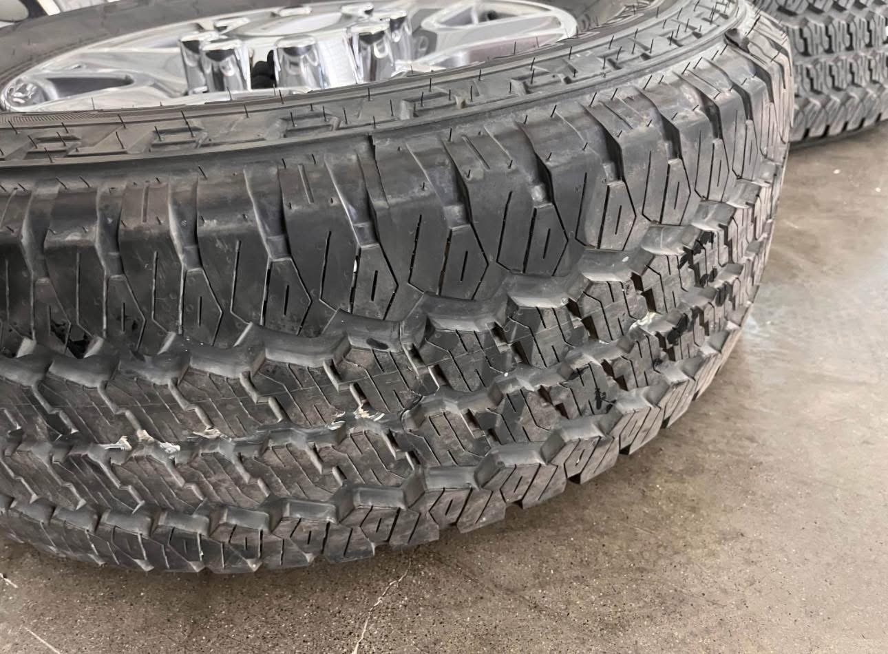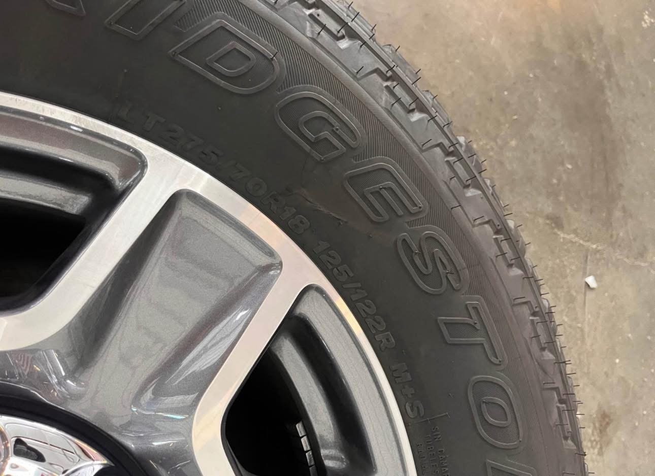 Tires are 275/70/18 Bridgestone dueler all terrain, load range E, top of the line tires. No patches or plugs in them, tires have less then 100 miles so they are basically brand new.