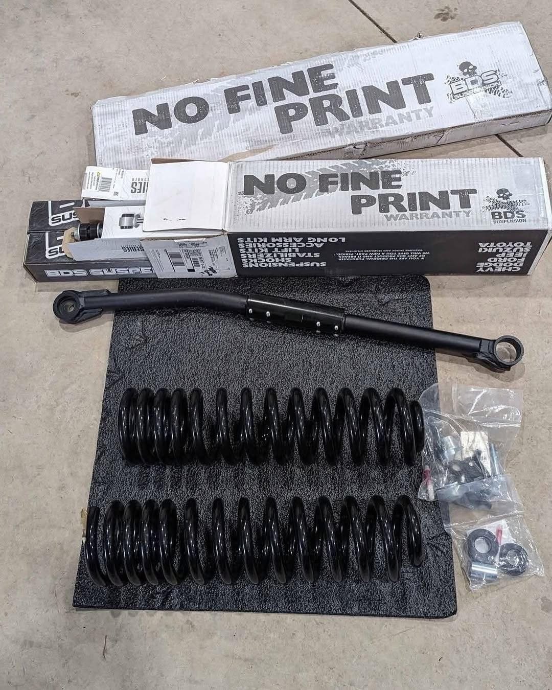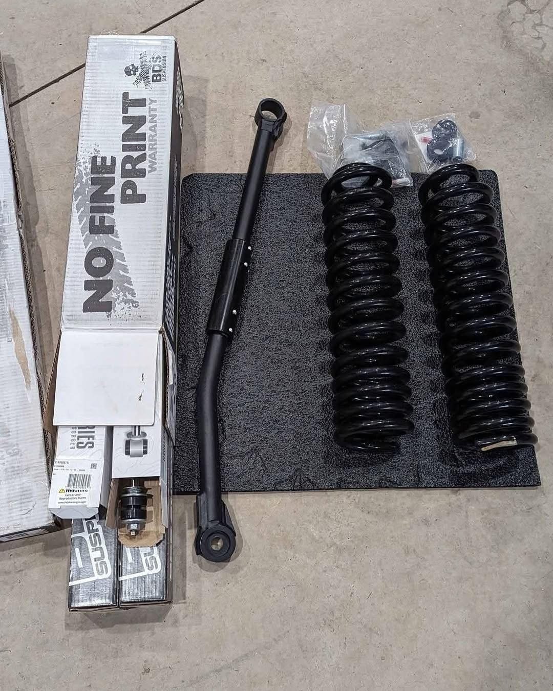 BDS progressive coil leveling kit. Comes with adjustable track bar, front-rear shocks, and all brackets needed.