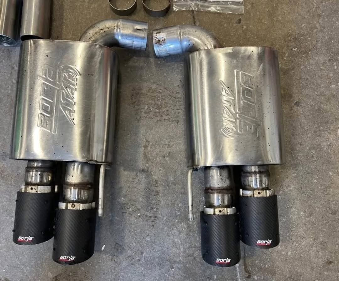 Borla ATAK cat-back exhaust Borla ATAK Cat-Back Exhaust with Black Carbon Fiber Tips. Mufflers are two years old. Rest of the pipes and clamps are new.Fits 2018- 23 mustangs