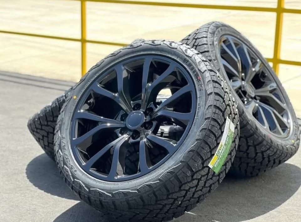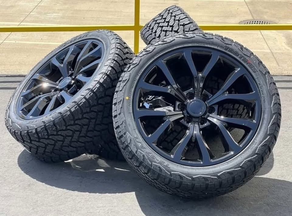 Brand new 22″ aftermarket black wheels 22X9.5 +31mm offset 6X135 Bolt pattern rims and All-terrain 285/45R22 tires