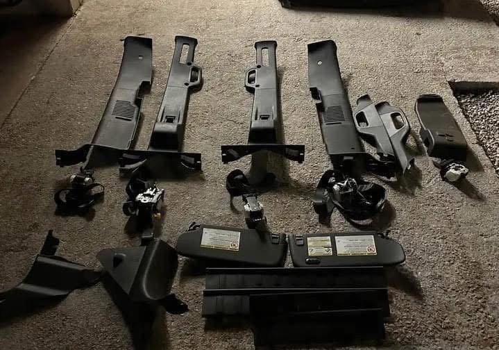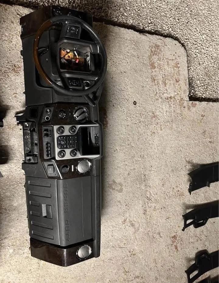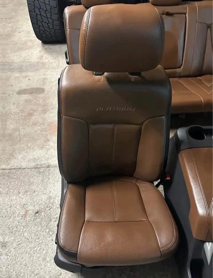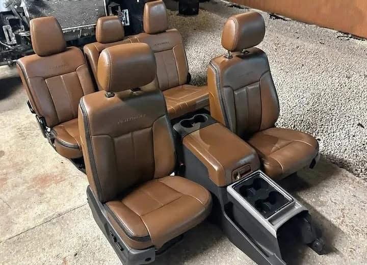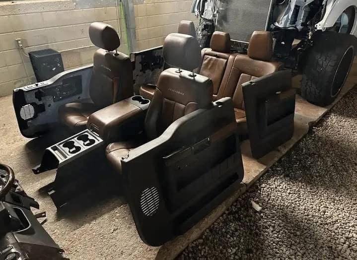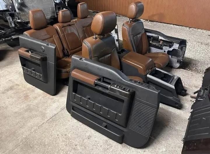 Ford F250/F350 platinum interior comes complete with everything seats center console door panels with switches pillars with seat belts and all plastic trimming carpet and headliner and complete dashboard only missing radio and driver airbag was deployed and both from seatbelts are deployed everything is in bran new condition.