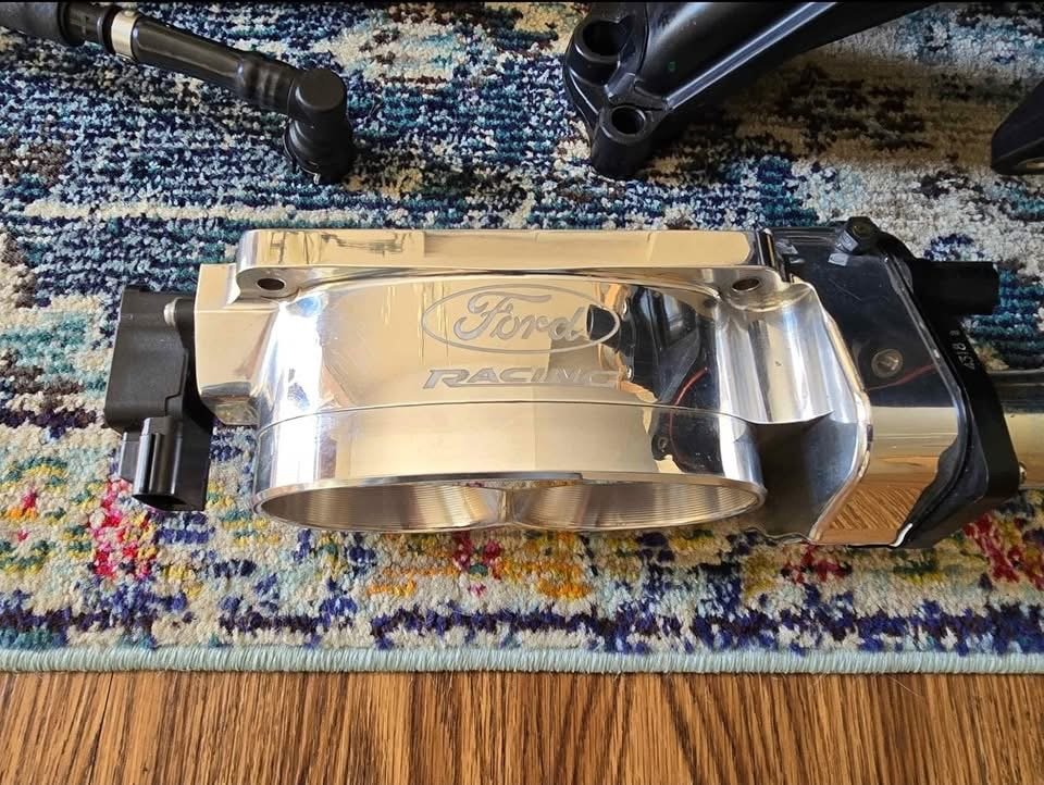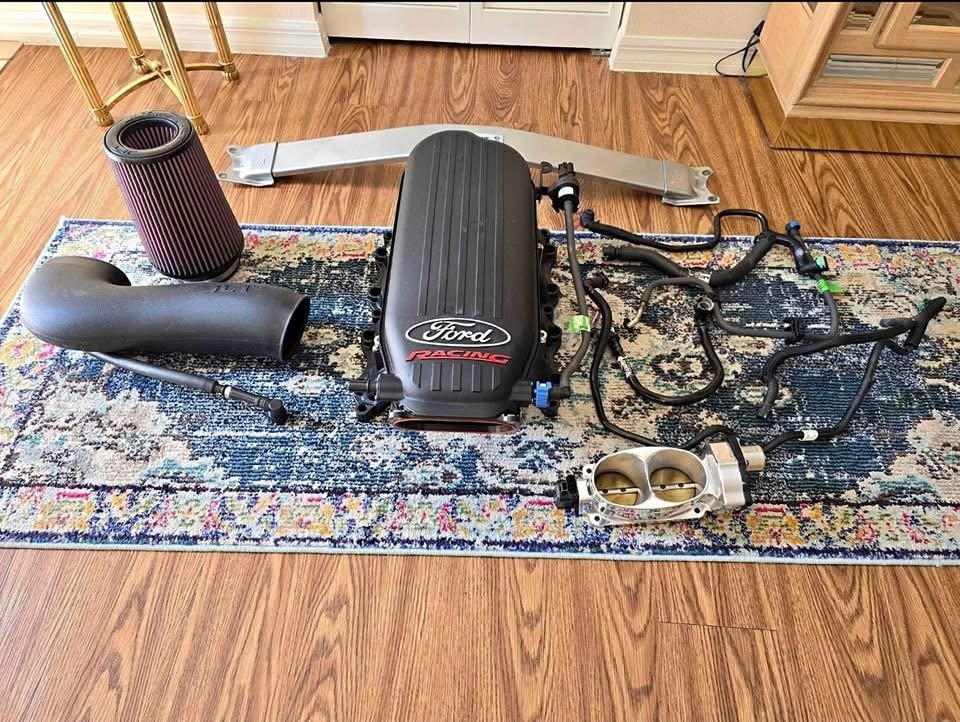 Original Ford Racing Cobra Jet Manifold, JLT Intake, all hardware, hoses, coolant fittings and wiring, Ford Racing twin 65mm throttle body and specific Cobra Jet strut bar. This is a package deal