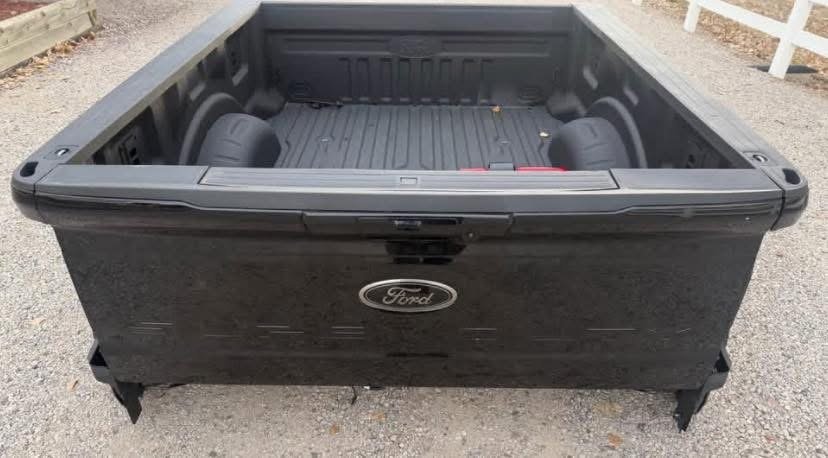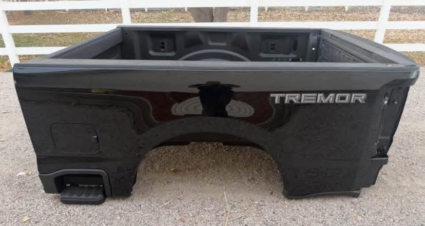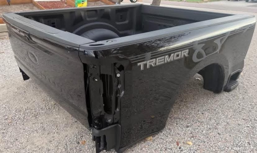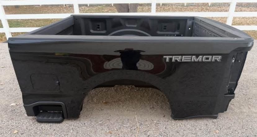 Ford Super Duty Short Bed Tremor Spec- Agate Black Metallic (2023-2025) – Brand New Take Off. Factory Spray In Bedliner, Includes the premium Power-Step Tailgate. Includes Radar/NON-LED Taillights, however the BLIS modules were removed.