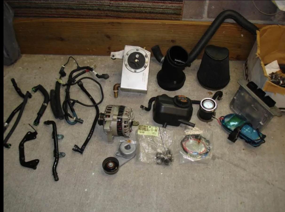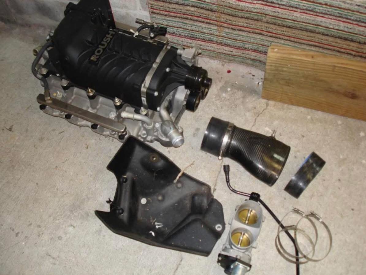 Supercharger/manifold/intercooler assy. and 52 lb injectors with fuel rails, mass-air meter, throttle body, air intake and K & N filter, Canton coolant reservoir, Roush boost gauge that goes in A/C vent, alternator (modified to be relocated), Daiblosport Predator with 2 tunes (Pump fuel and race fuel), and factory Ford ECU (2008 automatic trans. car), plus some misc. hardware.